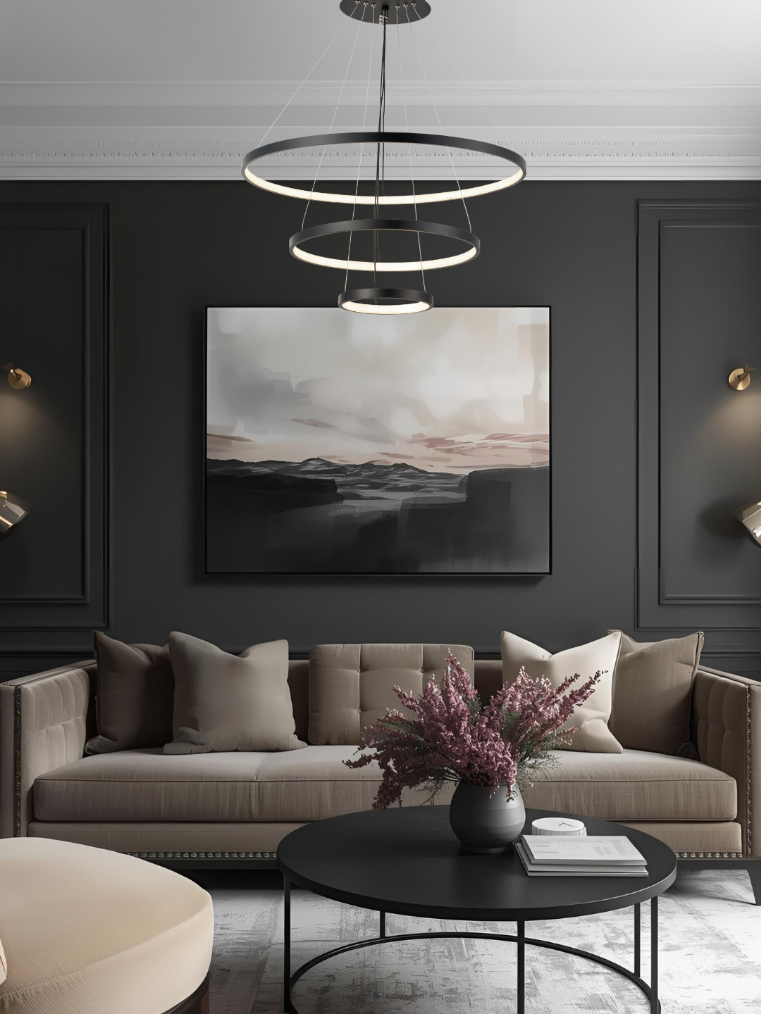 Trasforme seu ambiente com um design moderno, sofisticado e marcante. O Lustre LED Três Aneis possui 3 aneis suspensos criando um visual leve e elegant que combina perfeitamente para salas de estar, hall de entrada, pé-direito alto, áreias gourmet e ambientes comerciais.